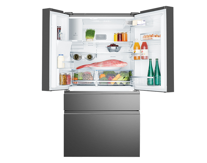 609L UltimateTaste 900 french door fridge, dark stainless with FlexFresh fully convertible entertainer's drawer, TasteLockAuto Easy-glide crispers with automatic humidity control, Slide-back and Flip-up shelves and in door ice & water dispenser