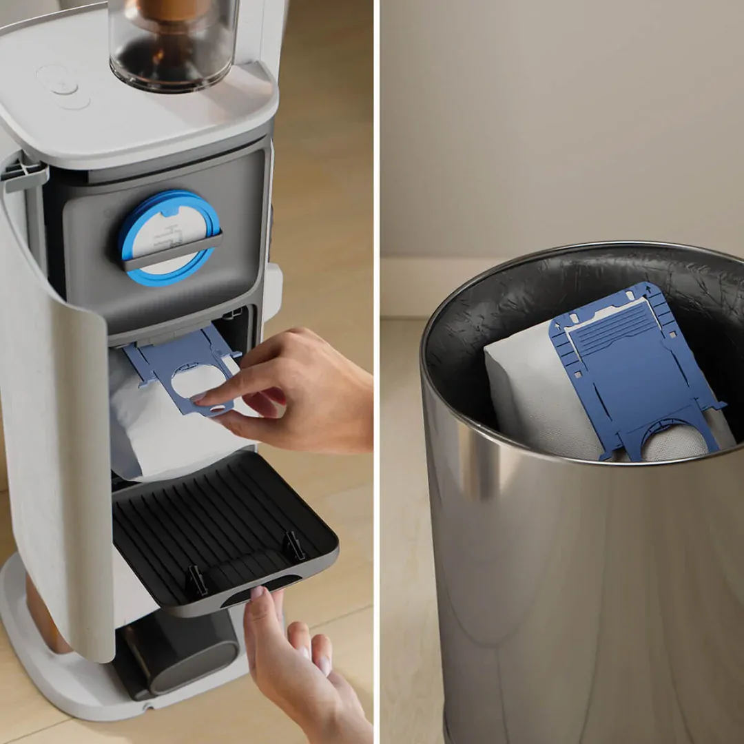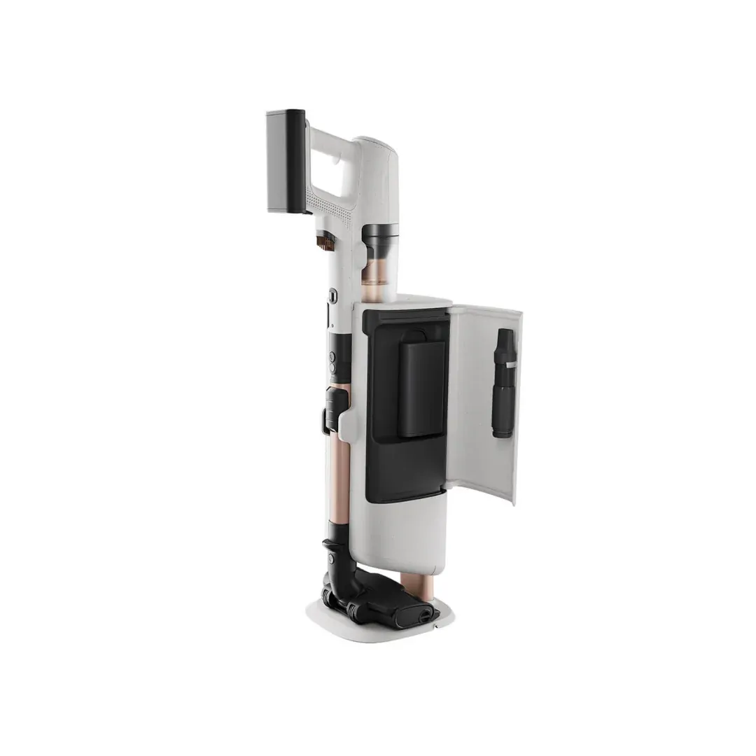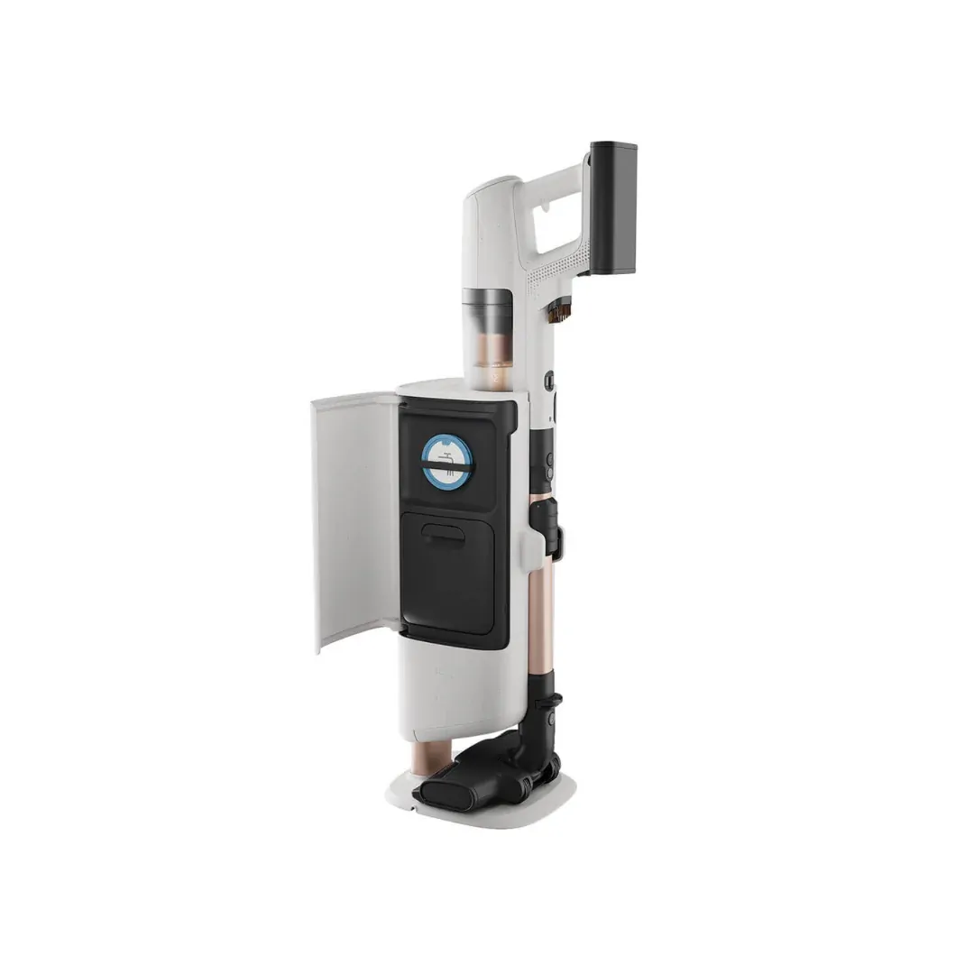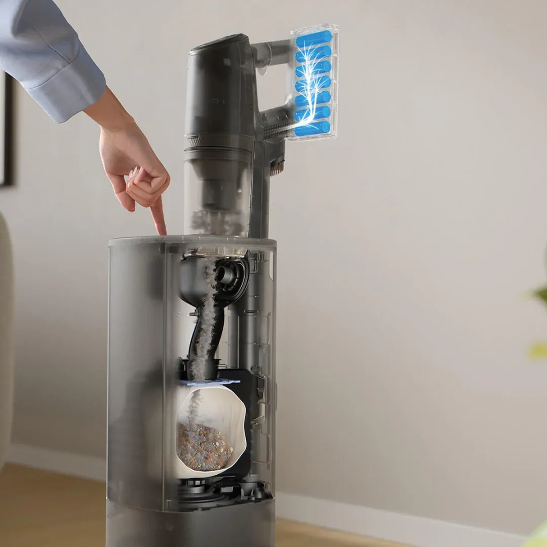 Maximise cleaning efficiency with the swivel-base emptying station. It offers seamless battery charging, integrated cleaning tools, and easy filter maintenance with an extra cleaning hose.