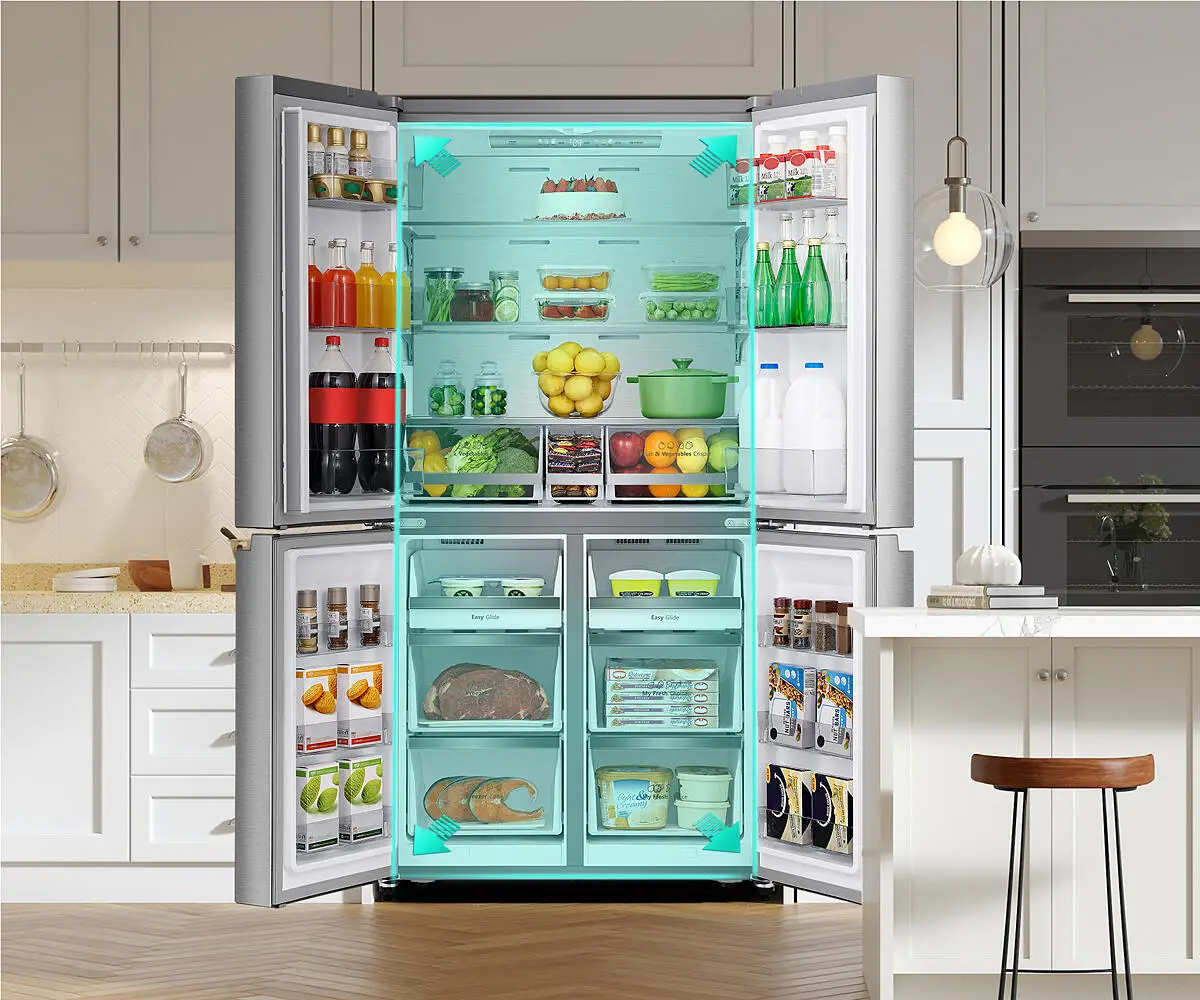 With a big capacity, there’s plenty of space in the fridge and freezer to store any shape or size of food. It also has four doors that open out wide, giving you better accessibility and enabling you to see everything at a glance.