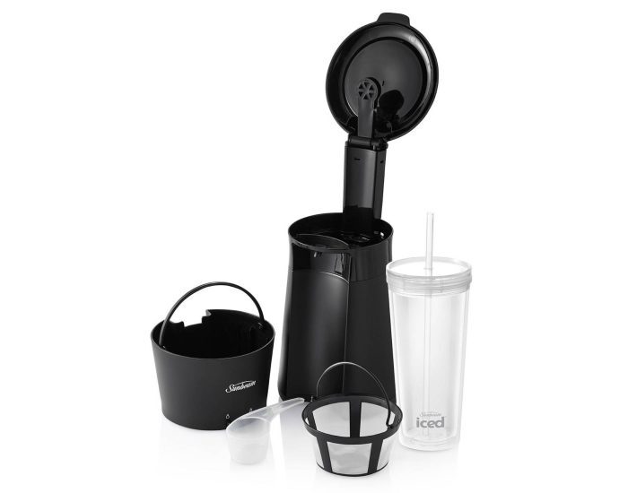 The Sunbeam Iced Coffee Machine SDP1000BK will help make delicious iced coffee at home in a reusable on-the-go tumbler. In three easy steps, this single serve machine quickly cools concentrated, hot-brewed coffee over ice, delivering flavourful iced coffee that’s never watered down. Simply fill the machine with water, scoop in grounds, brew over ice and enjoy.…all under four minutes! Personalise with syrups, milks and cream or get fun ideas with our iced coffee machine recipe book. The reusable tumbler provides on-the-go convenience while reducing waste. It’s Iced coffee, made easy.